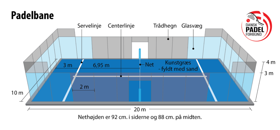 Dansk Padel Forbund har været hjælpsomme at illustrere, hvordan en padelbane er opbygget. Her kaldes ‘metalgitteret’ dog i steget ‘trådhegn’. Illustrationen kan være med til at fremme din forståelse af padel regler.