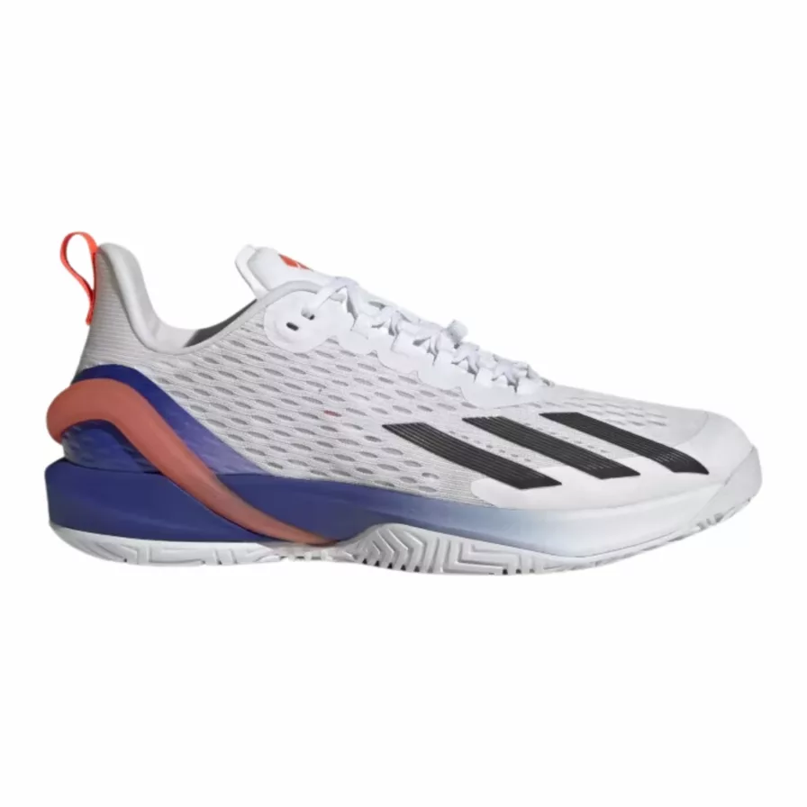 Denne letvægtssko fra Adidas giver sublim fart på banen, og passer til den aggressive spiller, der gerne vil kunne bevæge sig hurtigt rundt på banen. Skoene kommer i hvid med en flot farvekombination ved hælen af blå og orange.