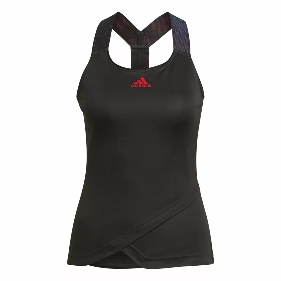 Tanktoppen har et stilrent design med farverige detaljer. Den y-formede strop bagpå er glitrende og farverig, og på fronten af toppen er det klassiske Adidas logo broderet i rødt!