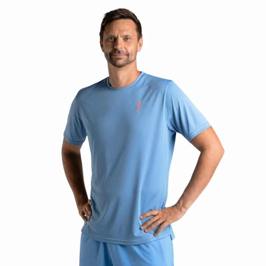 Ønsker du at skille dig ud på banen? Så skal du købe denne farverige t-shirt fra RS. Den er lavet af et åndbart, let og behageligt polyester materiale. Den har et stilrent design, der kombinerer en flot lyseblå farve med et blikfangende orange logo på brystet.