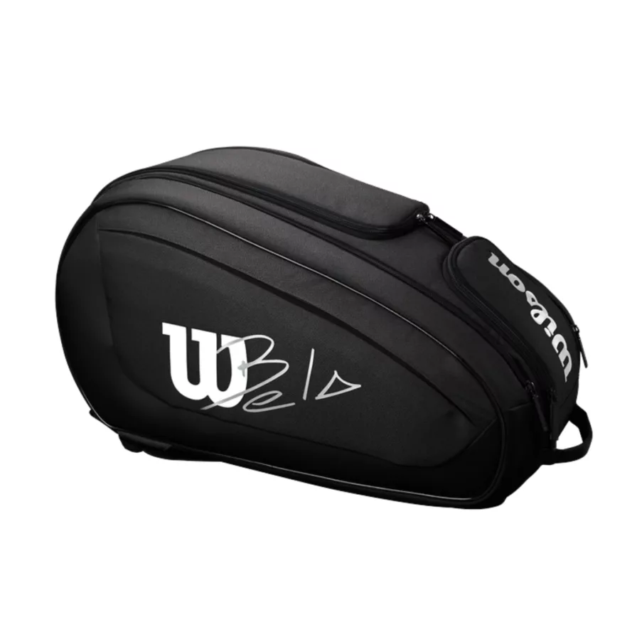 Wilson´s Bela Super Tour Padeltaske er udviklet i tæt samarbejde med padel stjerne Fernando Belasteguin. Tasken har masser plads til dit udstyr, derudover har tasken et stort rum hvor du sikkert kan opbevare padel bats, som er lavet i thermo. Det er et kæmpe plus så dit bat er beskyttet og ikke bliver udsat for temperaturændringer. Du får også et separat rum til dine sko, så det adskilt fra dit andet padel udstyr. Til sidste får du et stort rum i midten. Tasken kan justeres via dens stropper, så den passer perfekt til dig.