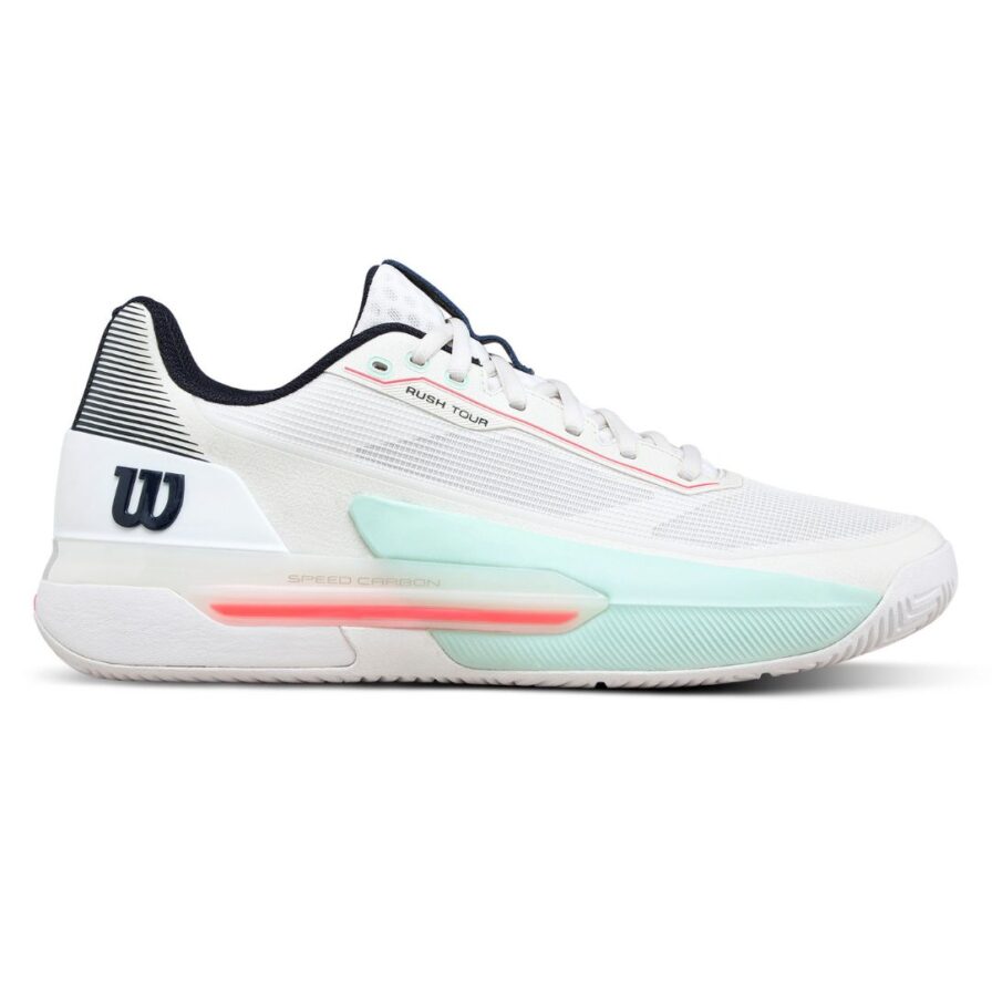 Wilson Rush Tour 5 White/Bay/Fiery Coral er skabt til den ambitiøse spiller, der kræver maksimal stabilitet, komfort og hurtighed. Den tætsiddende EndoFit-konstruktion omslutter foden og giver en intuitiv pasform, mens Dual Axis Speed Carbon Chassis sikrer fremragende lateral kontrol, så du kan stoppe, skære og accelerere med fuld sikkerhed. Den lette Gammaweave mesh-overdel kombinerer åndbarhed og holdbarhed, så du kan holde tempoet oppe point efter point. Samtidig giver Super Foam mellemsål og Drop-In Performance Sockliner responsiv støddæmpning og energireturnering under lange, intense kampe.